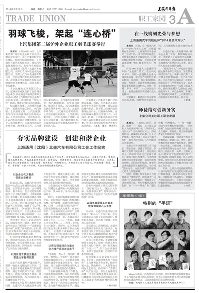 上海通用(沈阳)北盛汽车有限公司成立于2004年,目前共有员工5000余人,主要生产别克、雪佛兰两大品牌车型,产品涵盖豪华商务车、城市SUV、经济型轿车。结合合资企业的生产经营特点,多年来,该公司工会紧紧围绕“集成优势、创领未来”的战略核心,不断夯实工会工作基础,积极创建“有爱、有家、有梦想”工会工作品牌,为企业和谐发展保驾护航。