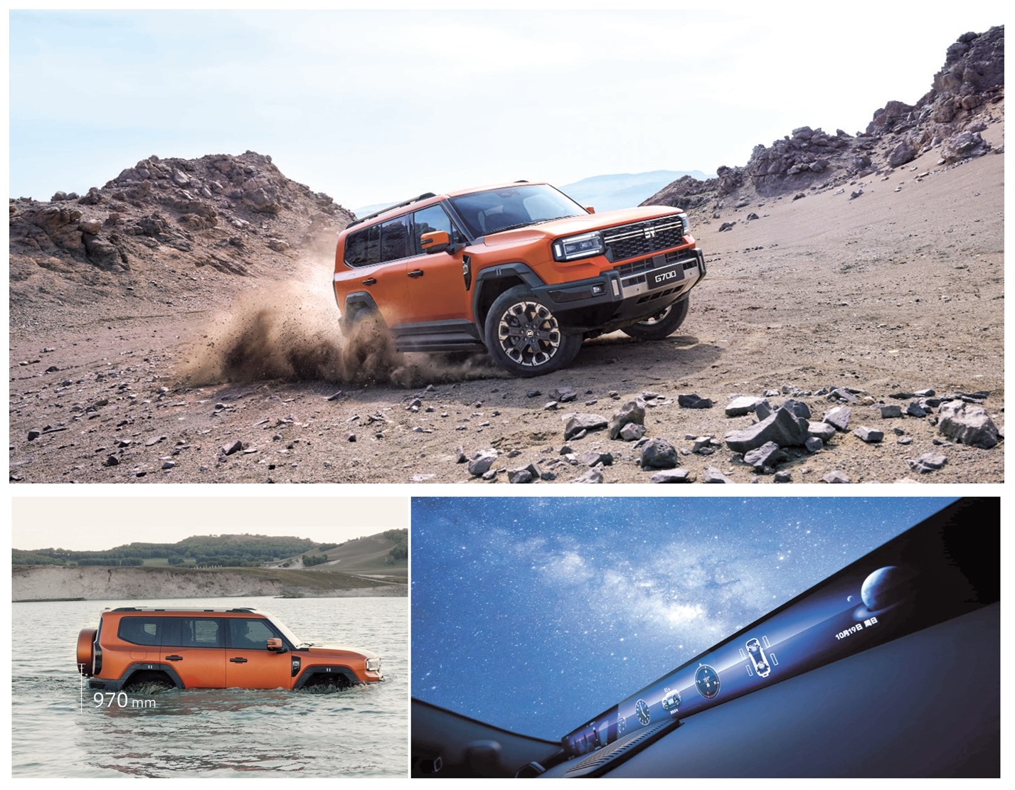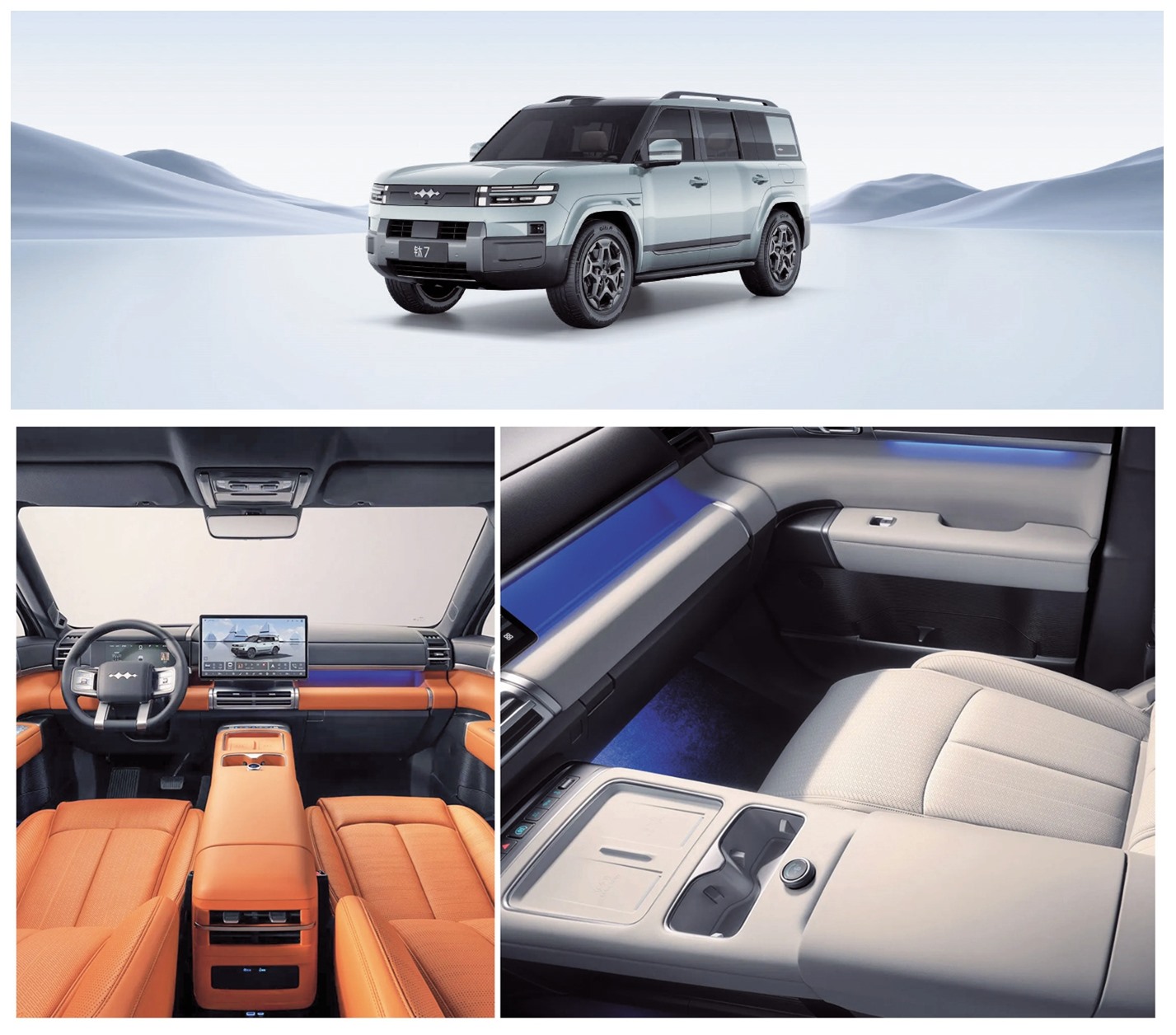 捷途纵横G700定位为中大型插电混动越野SUV,采用非承载式车身结构,搭配三把差速锁(前后电控牙嵌锁+中央锁),脱困能力出色,适合复杂路况。该车配备的空气悬架支持-50mm至90mm高度调节,离地间隙230-320mm,涉水深度达970mm,通过性远超同级别车型。车内配备双温控车载冰箱、18扬声器Lexicon音响系统、卫星通信系统等,兼顾越野与舒适性。