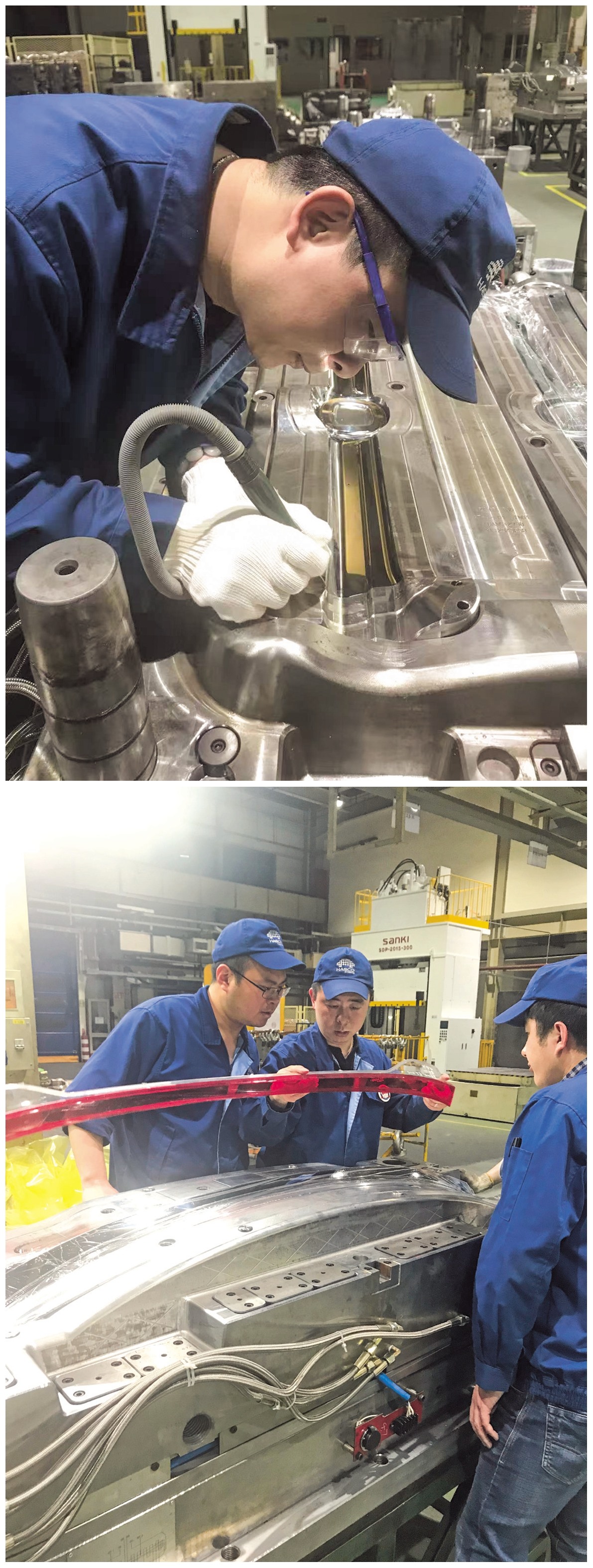 在许斌的带领下,团队还成功研制出国内第一套双色前大灯配光镜模具、国内第一套真三色后灯配光镜模具、第一套超厚壁聚光器三工位分层注塑模具……无数个“第一次”在他们手里一一实现。