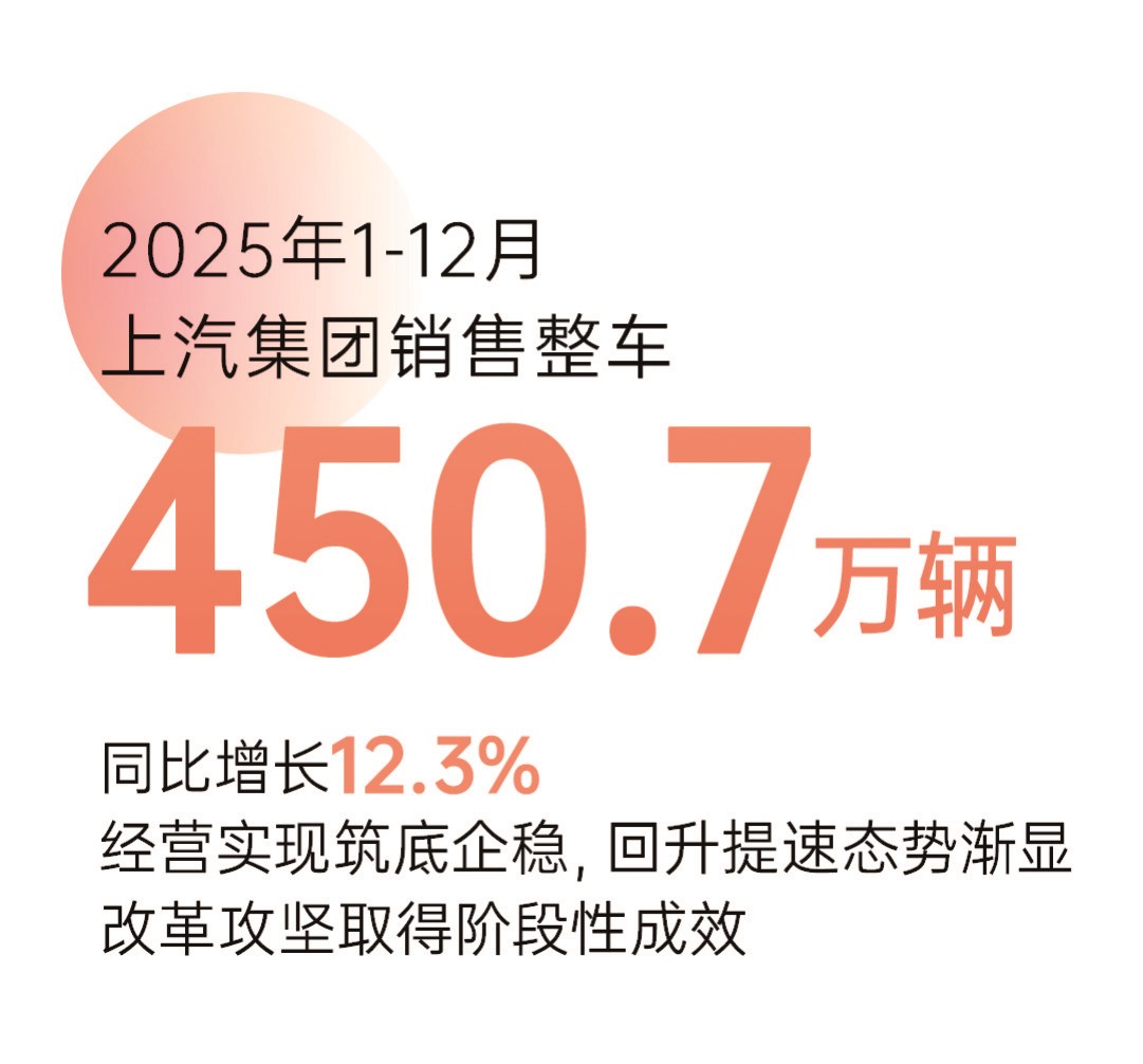 1月4日,上汽集团发布产销公告,2025年全年销售整车450.7万辆,同比增长12.3%,终端零售销量达到467万辆。上汽集团以全面深化改革为抓手,聚焦自主品牌建设与智电技术突破的转型战略取得显著成效。
