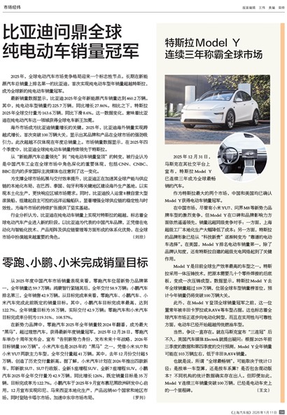 在新势力品牌中,零跑汽车2025年全年销量较2024年翻番,成为最大“黑马”,超过理想汽车,获得最新年度销量冠军。2025年12月28日,零跑汽车举办十周年发布会,宣布“告别新势力身份,发布未来十年战略,2026年目标销量100万辆”。小米汽车也是2025年的“黑马”之一,凭借小米SU7和小米YU7两款主力车型,全年交付量超41万辆。其中,去年12月份交付超5万辆,创造了历史交付量新高。据了解,小米汽车计划在2026年推出四款新车,即新款SU7、SU7行政版、全新5座增程SUV、全新7座增程SUV。小鹏汽车2025年全年交付量为42.9万辆,同比增长126%,既定销量目标是35万辆,目标完成率为122.7%。小鹏汽车于2025年9月宣布慕尼黑欧洲研发中心启用,12月宣布实现印尼、马来西亚本地化生产,产品远销60个国家和地区市场,同时登陆卡塔尔市场,加速中东非市场布局。(罗列)