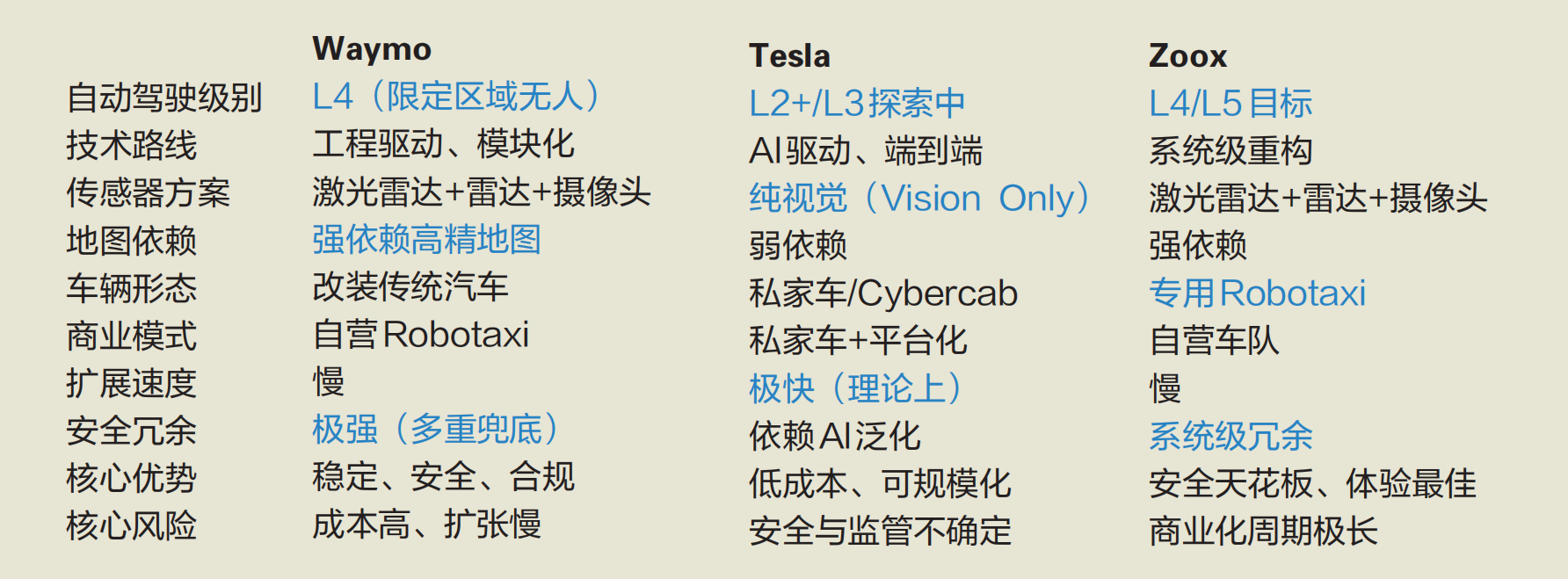 三种模式的比较,Waymo在自动驾驶领域相对先锋。