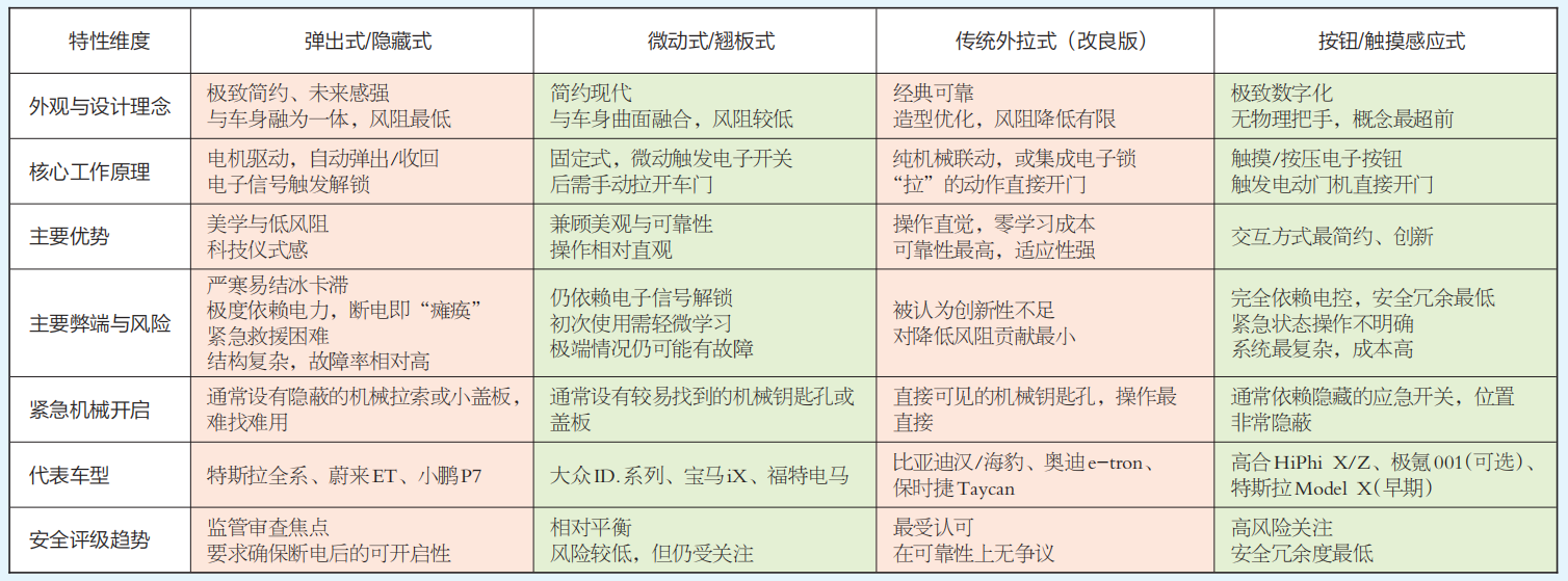 目前,主流的电动车门把手主要分为以下几种类型,各有其独特的设计特点、优势与潜在风险。
