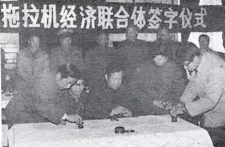 上海第一个以产品为纽带的经济联合体——上海拖拉机经济联合体日前举行签字仪式。图为成员厂厂长在协议上盖章签字。(本报记者摄)