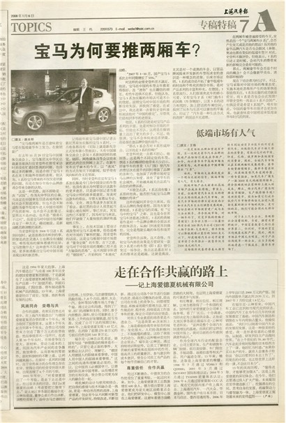 相互尊重、相互信任、相互理解,让双方都取得了一个和谐的关系。国外的几家爱德夏分公司来上海参观,看了厂区后,十分满意,当即决定为上海提供设备。正如亚太地区事务副总裁福尔克·云林对笔者所说:“亚洲是整个全球汽车快速增长的基地,而我们把宝押在中国市场上,我对目前的合作感到满意和高兴。”