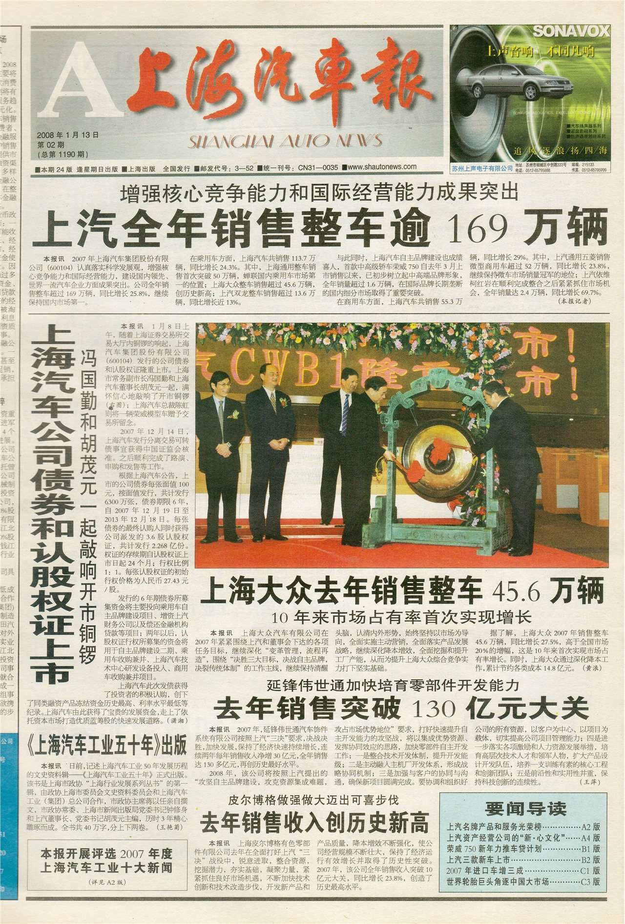 上海汽车报首页 上汽全年销售整车逾169万辆 上海汽车公司债券和认股权证上市 上海大众去年销售整车45.6万辆 去年销售突破130亿元大关 上海汽车公司债券和认股权证上市 《上海汽车工业五十年》出版 去年销售收入创历史新高