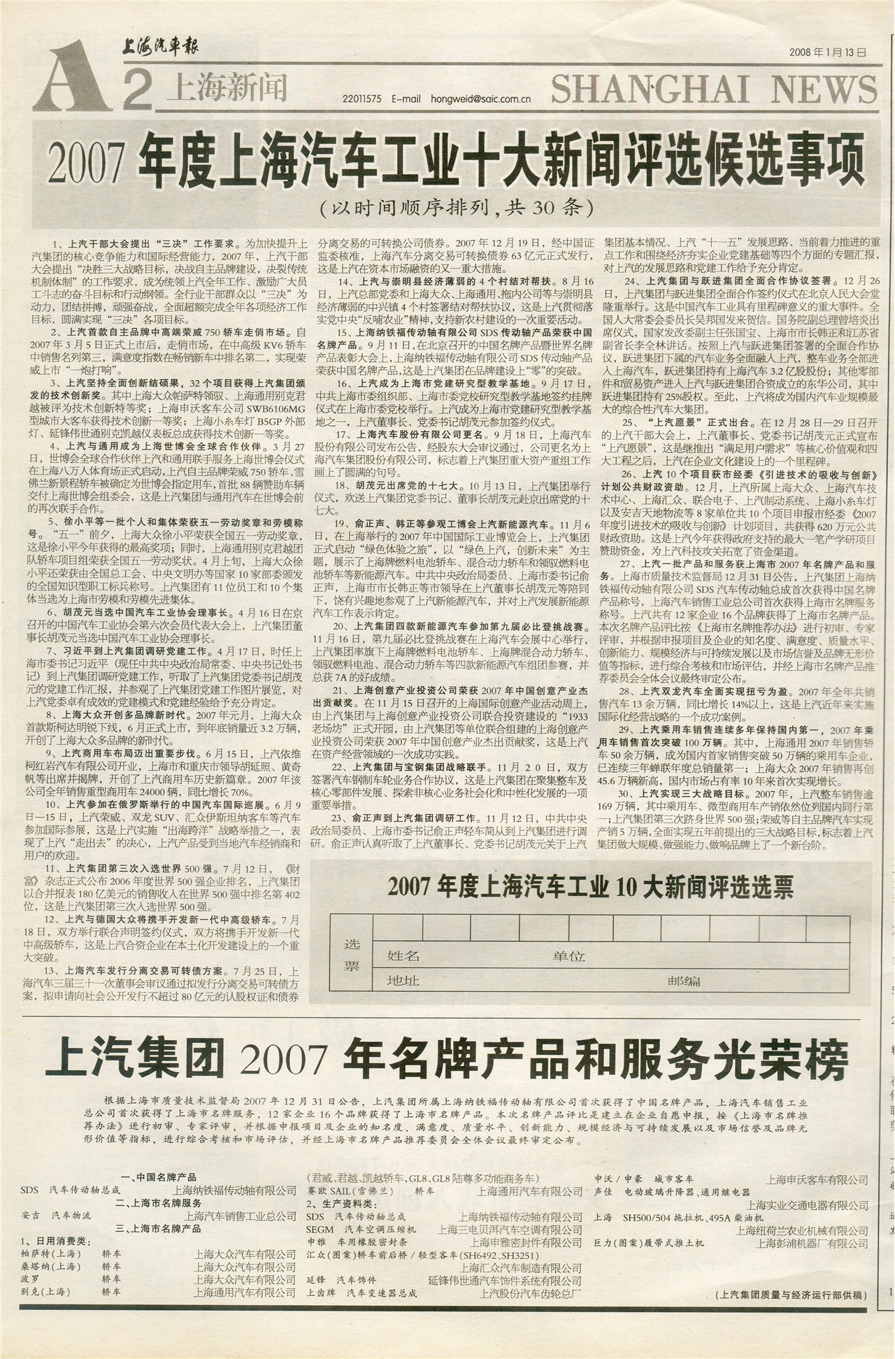 2007年度上海汽车工业十大新闻评选候选事项