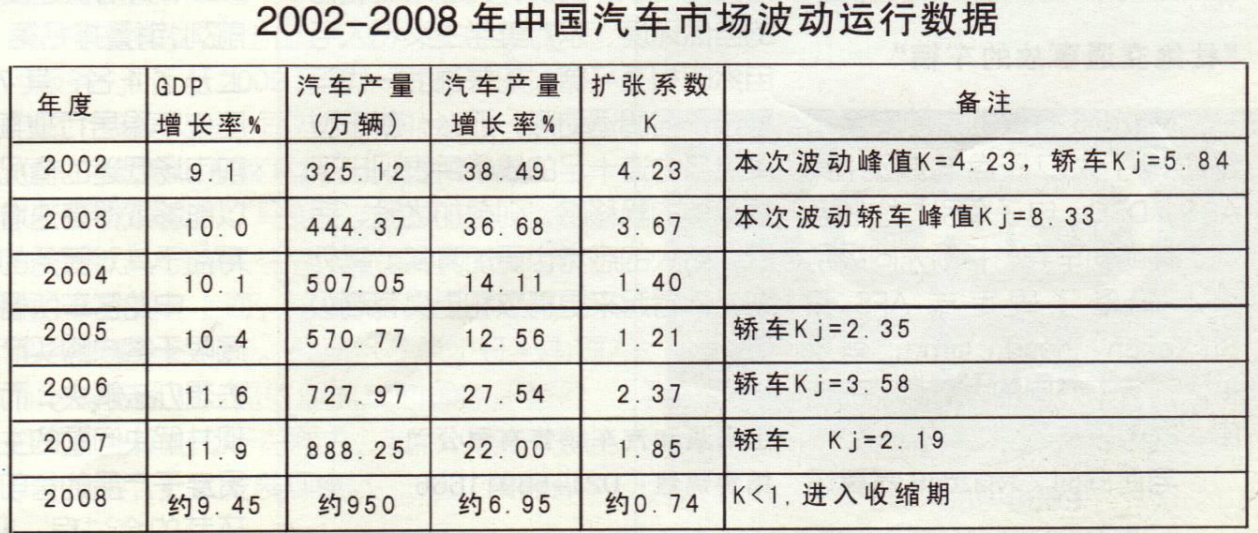 2009年是全球经济最困难的1年。国际货币基金组织从1944年以来首次公开预报“发达国家负增长”。中国已公布4万亿元扩大内需振兴经济方案。国家发展改革委把汽车工业列为2009年9大振兴产业之一,这对汽车业带来有利影响。预计当前的车市困难会延伸到2009年上半年,下半年稳步回升。业内外专家预测2009年汽车产量比2008年增长5%。笔者按乐观估计1000万辆,即汽车增长率为5.26%,按GDP增长率8.5%计算得到扩张系数K=0.619。这个数据说明,2009年汽车市场“收缩效应”比2008年更大,车市进入“波谷”,困难更大。