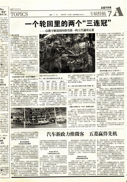 在微车几家生产厂商中,上汽通用五菱品牌优势最为明显。据统计,截至去年,上汽通用五菱连续3年在微车市场占据销售头名。2008年,以65万台的销量,占据了微车四成以上的份额。庞大的销量和市场占有率,使得五菱品牌进一步拉开了与对手的差距。