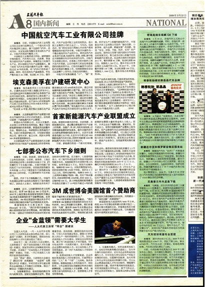 本报讯 日前,中国航空汽车工业有限公司在北京举行挂牌仪式,一个强大的大型汽车集团呼之欲出,旗下包括哈飞汽车、昌河汽车、东安发动机等整车及发动机生产企业。中航汽车将进行整体上市。