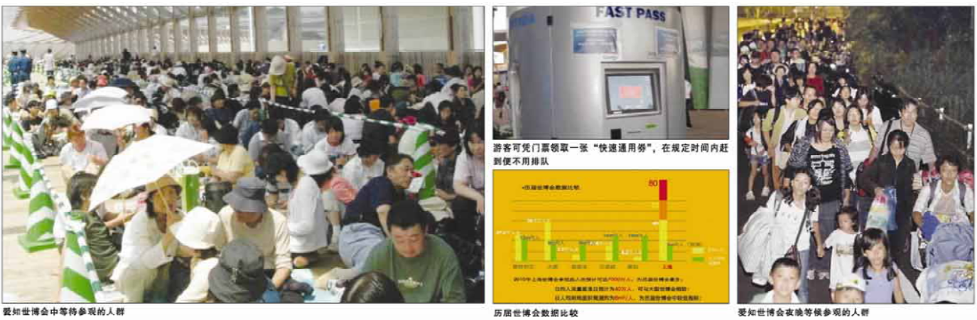 这段文字是爱知世博会开园第一天的报道,随着时间的推移,排队人流犹如一条条长龙在园区的各个角落不断壮大。据最终统计,爱知的参观人数达到2300万人次,庞大的参观人群在185大的展期集中通向各个展馆,每天平均10万人左右入场,每天最少入场人数为5万人,最高峰值达20万人以上。游客大约要排两个小时才能入园,而到了场馆后基本上也要排队,有的展馆门口更需要排5个多小时,以至于排队时间过长成为爱知世博会在管理上存在的最大问题。
