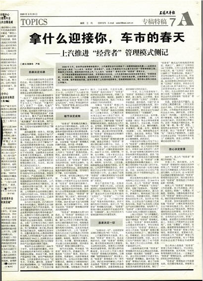 2008年3月,在世界金融海啸来临前夕,上汽集团在全行业掀起了一场管理创新的风暴——这就是在全行业深入推进“人人成为‘经营者’管理模式”。这是上汽集团迄今为止最为浩大的一项管理创新工程:准备用3年时间,整体构建并形成上汽“人人成为‘经营者’”管理方式和“经营者”管理文化。