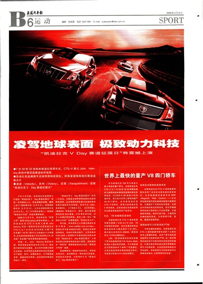 作为凯迪拉克106年以来动力最为强劲的量产轿车,全新凯迪拉克CTS-V以7分59秒32的单圈成绩成为德国纽柏林赛道性能测试新纪录缔造者。3.9秒的0-60英里/小时加速时间,使它成为世界上最快的量产V8四门轿车。在全新凯迪拉克CTS-V的背后,是强大的凯迪拉克V系列家族,这是凯迪拉克角逐世界车坛最高性能级别的产品系列。