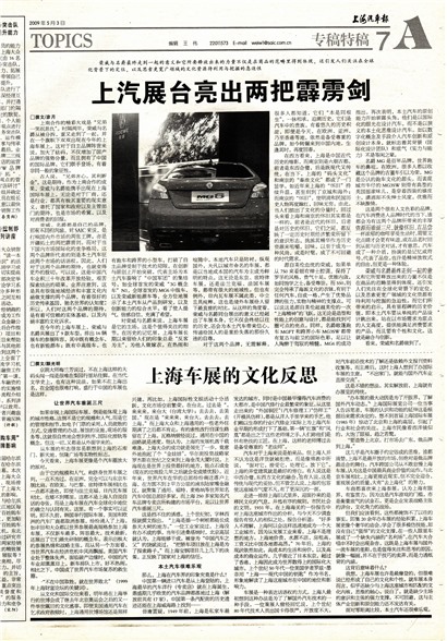 我想,上海车展也许是最摩登的,但很难说已经形成了自己的文化和个性。就车展本身而言,似乎还缺少与上海这座城市相匹配的文化内核,思维的轴心。说白了,就是缺少主场意识和主张的强力支撑。不可回避,这与主体产业创新和原创能力还不发达有关。