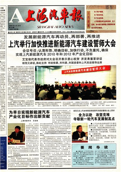 上海加快推进新能源汽车高新技术产业化,是一场攻坚战,主战场就在上汽。应该说,上汽2010年和2012年新能源汽车产业化的具体目标,具有相当挑战性。市委、市政府领导高度重视新能源汽车工作,俞正声书记、韩正市长最近多次组织专题研究,广泛深入了解情况,亲自抓协调推进。希望上汽各级领导干部务必深刻体会任务的紧迫性和艰巨性,加强领导、狠抓落实,带领全体员工群策群力、扎实工作,在自主创新中充分发挥国有企业主力军作用,尤其要做到:1、以油电混合动力汽车和纯电动汽车产业化为主攻方向,既定目标后墙不倒。2、以“电池、电机、电控”等关键零部件为突破口,加快形成新能源汽车关键零部件产业集群。3、以新能源汽车产业化突破为契机,加速形成一批创新成果和一支高端人才队伍。