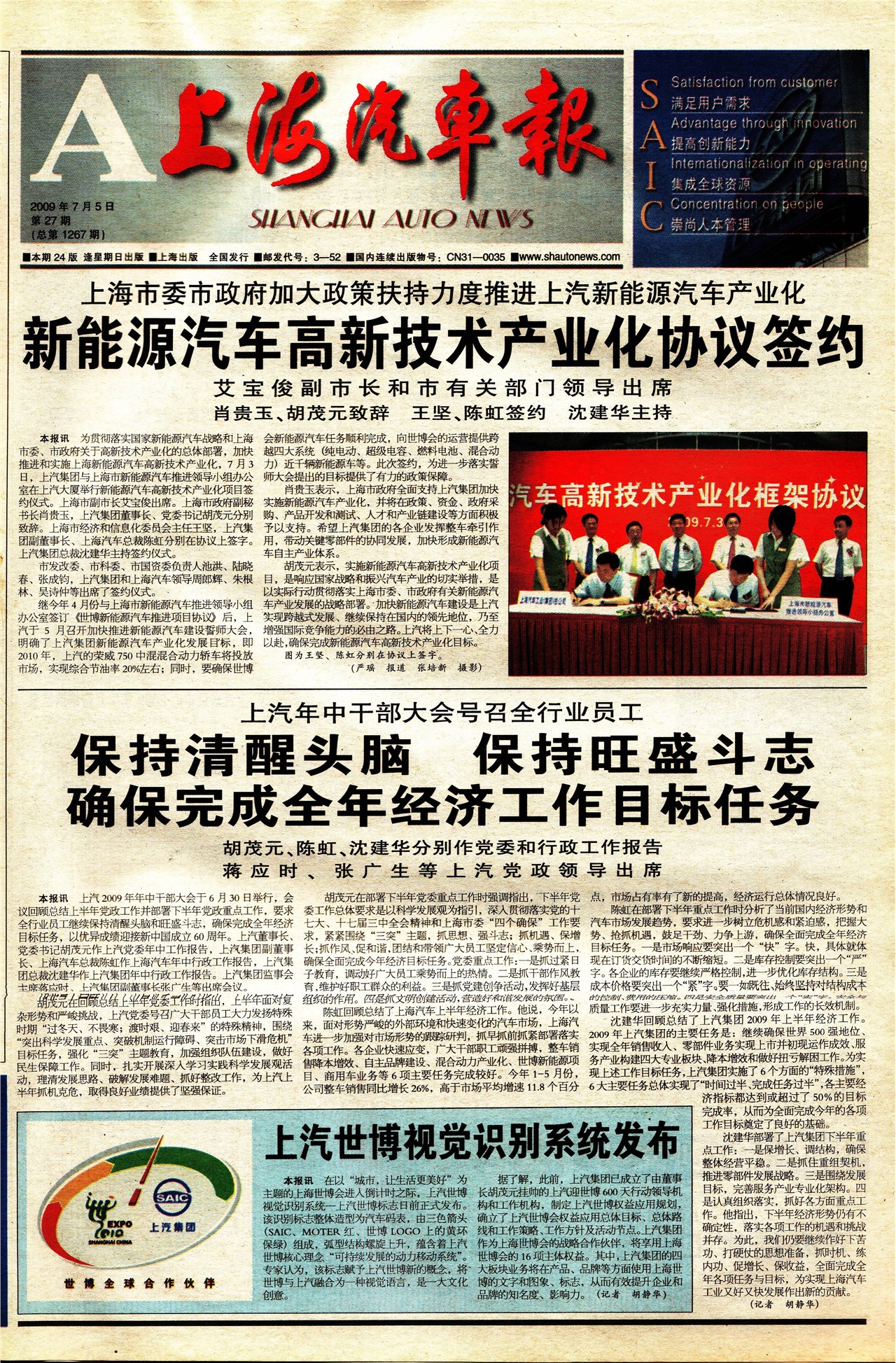 上海汽车报首页 新能源汽车高新技术产业化协议签约 保持清醒头脑 保持旺盛斗志 确保完成全年经济工作目标任务 保持清醒头脑 保持旺盛斗志 确保完成全年经济工作目标任务 上汽世博视觉识别系统发布