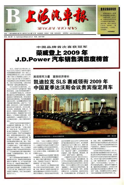 近日,权威汽车评级机构J.D.Power亚太公司发布了2009年中国汽车销售满意度指数调研(SSI)报告,上汽荣威品牌表现出色,以851分的成绩(满分1000分)荣登榜首,这是在J.D.Power中国已经开展10年的调研中,中国品牌首次以创纪录的最高分荣获冠军,实现了历史性的突破,也是对荣威“尊荣体验”服务品牌的最佳肯定。