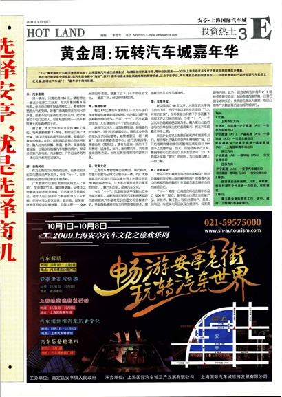 “十一”黄金周有什么娱乐休闲好去处?上海国际汽车城已经准备好一场精彩绝伦的嘉年华,等待你的到来-2009上海安亭汽车文化之旅欢乐周即将拉开帷幕。坐在自己的爱车中看电影,在汽车后备厢中“淘宝”,到F1赛车场亲身体验风驰电掣的驾驶快感,泛舟于安亭泾、汽车博览公园的闲适自在……你所能想到的一切时尚现代与民俗文化元素,都将在汽车城“十一”嘉年华中得到体现。
