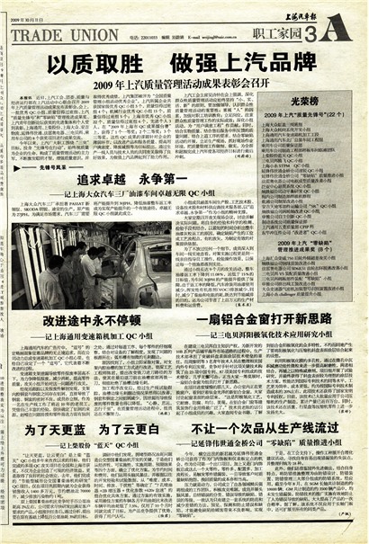 本报讯 近日,上汽工会、团委、质量与经济运行部在上汽活动中心联合召开2009年上汽质量管理活动成果发布表彰会。会上,一批优秀QC小组、质量信得过班组、上汽“质量先锋号”和“零缺陷”管理推进成果奖上汽青年创新论坛获奖的先进集体和个人受到表彰,上海通用、上柴股份、上海大众、安吉物流、延锋伟世通、法雷奥电器、三电贝洱、乘用车公司的8个获奖项目进行成果交流。