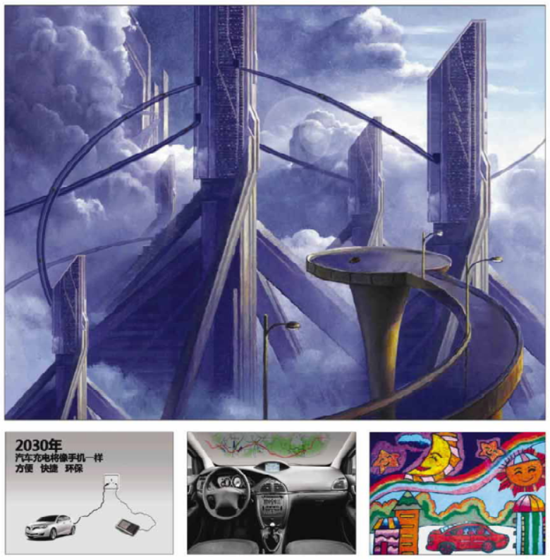 清晨,伴随着朝阳,一辆辆自动驾驶汽车在城市道路间自由穿梭。尽管城市中已不再有交通标志,但借由车辆和交通基础设施之间的电气化及信息连接化,一切井然有序,人们不再为交通阻塞而烦恼;傍晚,结束了-一天的工作,打开车厢内高科技智能娱乐设备,挡风玻璃化身液晶屏幕,人们可自由选择自己喜爱的节目,驾驶不再成为一种负担,汽车将成为娱乐、工作的好伙伴。