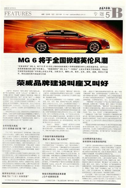 开创了车市“数字汽车时代”的荣威550,在推出全面升级的2010款后,以更为人性化、数字化的高科技实用配置进一步提升产品竞争力;荣威550以月销量持续超过7000辆的成绩,正式迈入主流车型阵营,得到市场高度认可,9月份更以接近8000台的销量占据A+级车的主流。流。国际化的自主品牌在中高端公、商务市场的典范之作——荣威750系列轿车,用09款新车型将“优雅公商务”的理念继续发扬光大。3G概念车荣威N1,宣告迎接“汽车3G大时代”的到来,以3G时代的全新设计理念和配置,继续引领汽车信息化、网络化潮流。