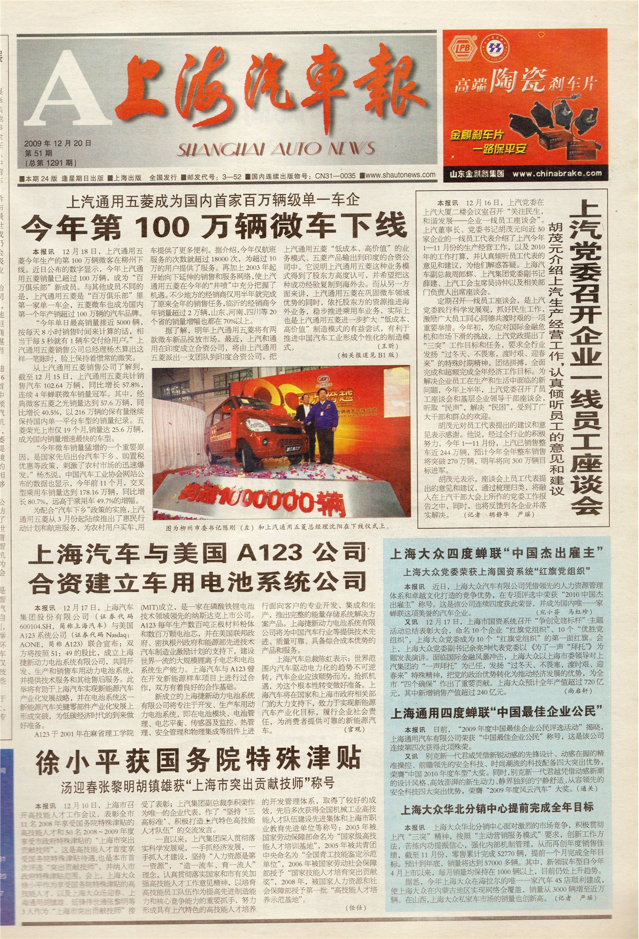 上海汽车报首页 今年第100万辆微车下线 上汽党委召开企业一线员工座谈会 上海汽车与美国A123公司合资建立车用电池系统公司 徐小平获国务院特殊津贴 上海大众四度蝉联“中国杰出雇主” 上海通用四度蝉联“中国最佳企业公民” 上海大众华北分销中心提前完成全年目标