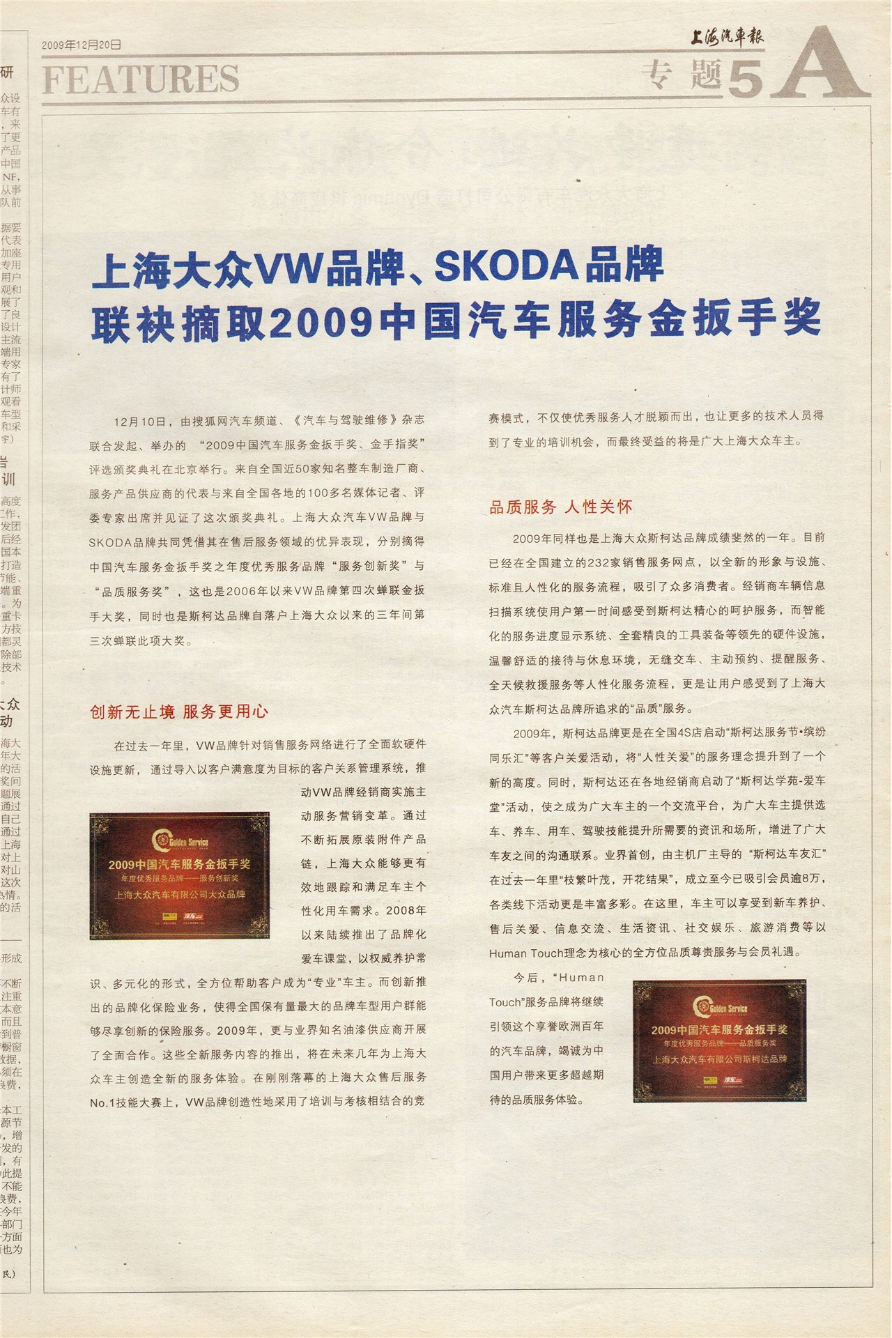上海大众VW品牌、SKODA品牌联袂摘取2009中国汽车服务金扳手奖