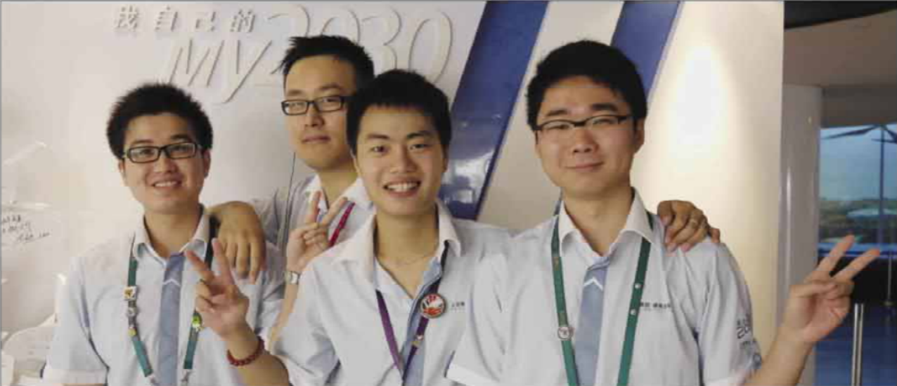 左下图:正是有了傅晓鸣、唐魏、叶霖捷和陈智杰(从左至右)这样的志愿者,汽车馆的服务才令游客交口称赞
