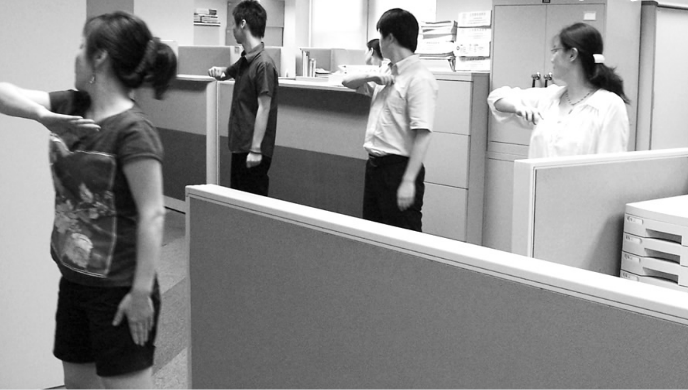 每天下午2点,上汽信息公司的员工们都会伴着轻快的乐曲走出“格子间”,聚集到办公区的空地上集体做工间操。