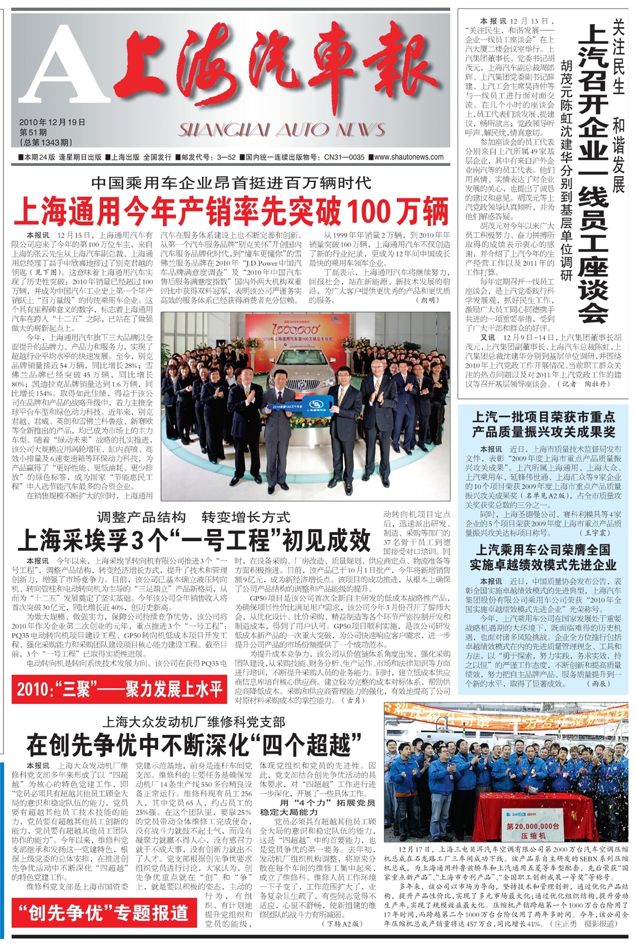 上海汽车报首页 上海通用今年产销率先突破100万辆 上海采埃孚3个“一号工程”初见成效 上汽召开企业一线员工座谈会 上汽一批项目荣获市重点产品质量振兴攻关成果奖 上汽乘用车公司荣膺全国实施卓越绩效模式先进企业 在创先争优中不断深化“四个超越” 图片新闻