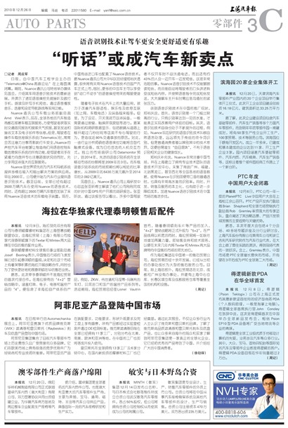 日前,由中国汽车工程学会主办的“Telematics@China高峰论坛”在上海圆满闭幕。其间,Nuance通讯公司特地举办媒体见面会,介绍其车用语音识别技术的最新进展,并演示了诸如语音操控免提接听及拨打手机、朗读及听写手机短信,通过语音播放音乐、选歌和设定导航路线等实用功能。