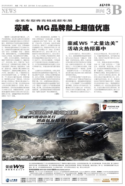 随着第十五届成都车展开幕在即,上汽不仅将携荣威、MG两大品牌全系车型惊艳亮相成都世纪城新国际会展中心3号馆5号展位,更将带来史无前例的超值优惠惊喜:荣威350特推“冰典版”车型,仅需69800元:荣威550直降35000元外加4000元礼包;以超越同级的金融特惠方案打造的MG全系“2012 UK限量版”车型……超低的价格、超额的金融补贴,只为倾情回馈蓉城车迷对上汽荣威、MG品牌的支持与厚爱。
