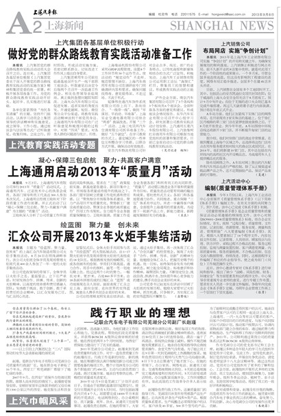 本报讯 9月2日,上海通用汽车有限公司举行2013年“质量月”启动仪式,上海通用汽车、泛亚技术中心的执委会成员、各部门领导和员工代表近300人参加本次仪式。上海通用总经理王晓秋对下阶段质量工作进行部署,并正式启动了以“凝心·保障三包启航,聚力·共赢客户满意”为主题的“质量月”活动。