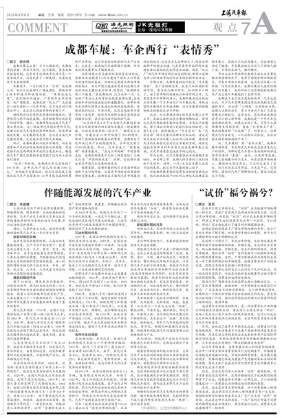 “从当初不足1万平方米的汽车展销会演变为今天跻身国内四大国际车展之一的成都车展,已经成为城市的一张名片。”据有关人士介绍,车展业在10年中保持了20%的增长,带动了高档宾馆和服务业的繁荣,这都源自近年来汽车产业的高速增长,去年竟达到了47.8%的速度。所以,汽车业成了“财富成都”的重要基石,“五大兴市战略”中的重要支柱。成都在刚落幕不久的《财富论坛》上被定位为“中国的新未来”。同样,它也预示着这里是中国汽车发展的新未来。