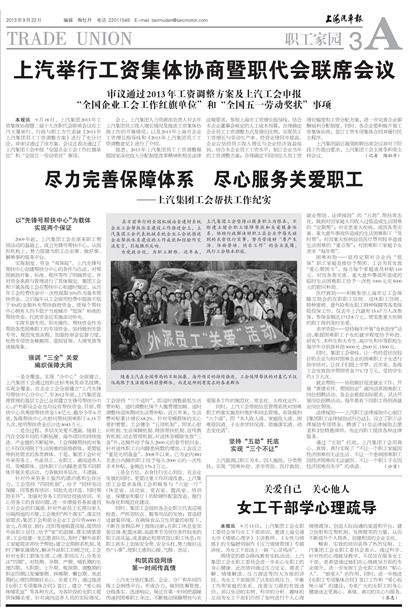本报讯 9月18日,上汽集团2013年工资集体协商暨二届十九次职代会联席会议在上汽大厦举行,行政与职工方代表就《2013年上汽集团员工工资调整方案》进行了充分讨论,并审议通过了该方案。会议还表决通过了上汽集团工会申报“全国企业工会工作红旗单位”和“全国五一劳动奖状”事项。