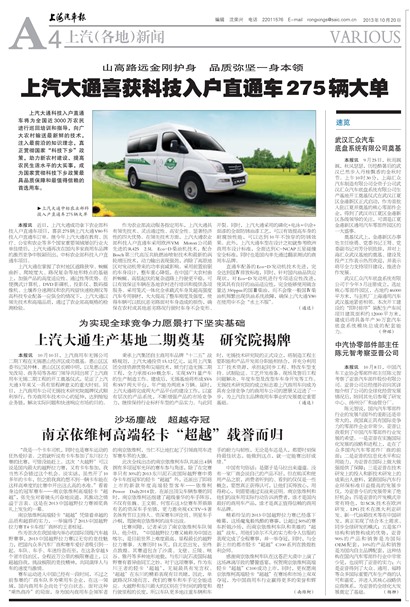 秉承上汽集团自主商用车品牌“十二五”战略规划,上汽大通投资15.12亿元,运用上汽集团全球资源优势和尖端技术,倾力打造无锡二期工程,全力承接G10概念车,实现SV71量产车的生产制造工作。建成后,无锡基地将形成SV6和SV7两大平台,年产能为两班8万辆。届时,上汽大通将完成两大产品平台的建设工作,以富有层次的产品系统,不断增强产品的市场竞争力,继续保持行业标杆车型的产品实力。与此同时,无锡技术研究院的正式设立,将制造工程主要职能和产品开发部分职能相结合,并充分利用工厂技术资源,承担起同步工程、特改车型支持、试制验证、工艺开发准备、现场及售后工程问题解决、年度车型及改型车车身开发等工作。无锡技术研究院的成立标志着上汽商用车向成为具有全球竞争力的商用车公司的愿景又迈进了一步,为上汽自主品牌商用车事业的发展奠定重要基础。(通达)