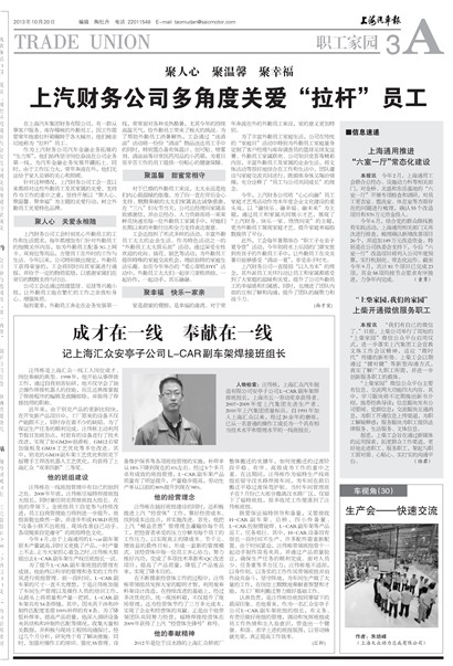针对这种情况,上汽财务公司工会一直以来都将对这些外勤员工及其家属的关爱、支持作为工作的重中之重,坚持开展以“聚人心、聚温馨、聚幸福”为主题的关爱行动,树立外勤员工关爱特色品牌。