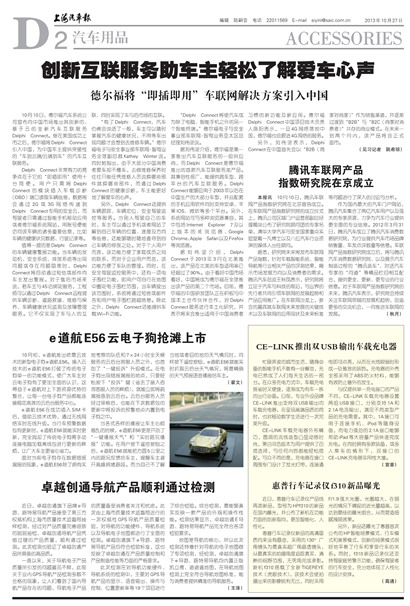 10月10日,德尔福汽车系统公司宣布向中国市场推出其创新的、基于云的全新汽车互联服务Delphi Connect。继在美国成功上市之后,德尔福将Delphi Connect引入中国,为中国车主提供突破性的“车到云端/云端到车”的汽车互联服务。