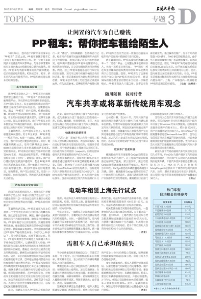 10月10日,国内首个P2P汽车分享平台“PP租车”正式上线。PP租车隶属于爱车汇(北京)科技有限责任公司,是一个基于互联网技术的便捷汽车共享平台,为乐于共享爱车的车主提供通过出租爱车使之获利的服务。同时,PP租车为有租车需求的用户提供便捷、低价的就近租车服务。和其他订车、租车、拼车的汽车出行服务不同,PP租车做的是私家车的租赁生意。