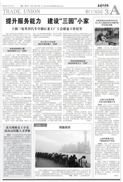上海三电贝洱汽车空调有限公司石龙工厂的绝大部分员工主要从事一线生产工作,该工厂工会自成立以来,始终将企业的发展和员工的需求相结合,提升基层服务能力,努力将工会建设成为持续学习的“校园”、和谐温馨的“家园”和经营有方的“乐园”,带动了整个小家的生产经营业绩,取得了可喜的成绩。