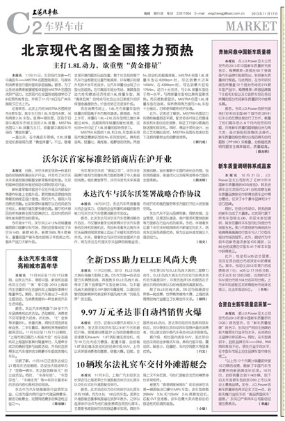 本报讯 据J.D.Power亚太公司发布的2013年度中国新车质量研究(IQS)报告显示,在“新车质量品牌”排名中,东风日产的自主品牌启辰大幅领先行业平均水平,在合资自主品牌中排名第一。同时,在车型调研中,启辰品牌双车——D50、R50同样表现不俗,领先行业平均水平,在中型车市场上自主品牌车型中排名第二。