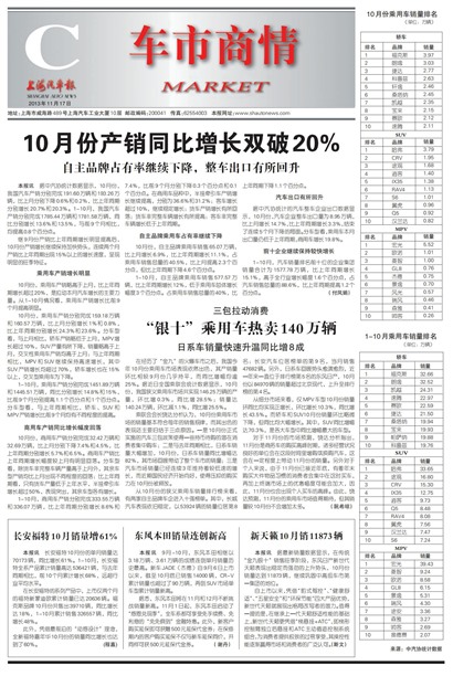 10月份,自主品牌乘用车销售65.07万辆,比上月增长6.9%,比上年同期增长11.1%,占乘用车销售总量的40.5%,比上月提高2.3个百分点,但比上年同期下降4.6个百分点。