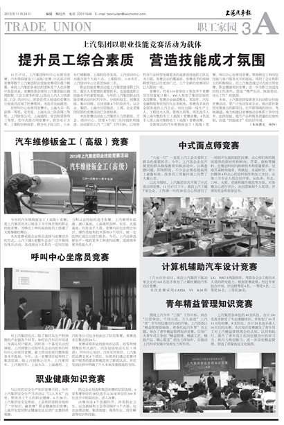 未来,上汽集团将探索更早启动职业技能竞赛活动、更广泛发动各家企业,推出紧扣集团发展重点的新项目,打开新领域的培训、考核通道,竭力构建以竞赛推动全体职工争学技术、比拼技能、提升产品和服务质量的长效机制,创造“技能成才”的良好环境。(本版撰文 杨阳)
