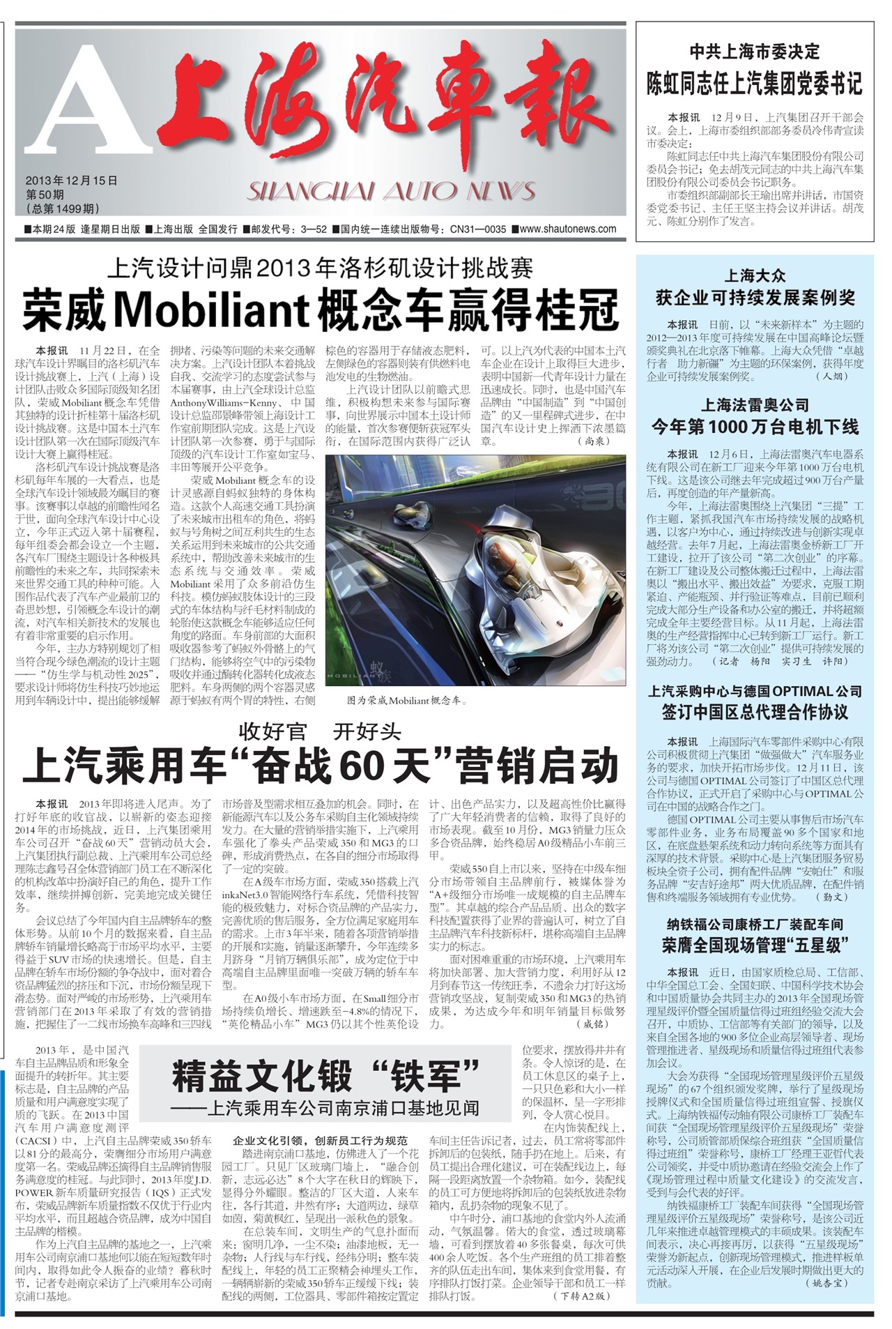 上海汽车报首页 荣威Mobiliant概念车赢得桂冠 上汽乘用车“奋战60天”营销启动 精益文化锻“铁军” 上海大众获企业可持续发展案例奖 上海法雷奥公司今年第1000万台电机下线 签订中国区总代理合作协议 荣膺全国现场管理“五星级” 陈虹同志任上汽集团党委书记