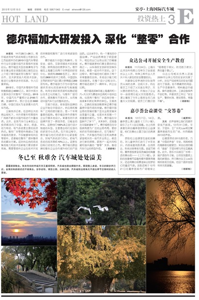 德尔福连续8年被上海通用和一汽-大众评为最佳供应商和十佳供应商,也是两个整车厂供应商中唯一连续8年获此殊荣的单位。王展表示,正确的发展战略是保证德尔福赢得中国市场的关键。德尔福中国业务的发展对整个亚太业务发展来说是重中之重,也是未来发展一个很重要的基石。今年,德尔福在中国新开了3个厂,未来3年,还准备在中国新建6个厂。德尔福将会在中国拥有更为广泛的业务布局,更好地抓住市场的增长点,在与整车厂合作、汽车售后市场乃至和消费者紧密相关的一些汽车业务上,都会进行新的探索,跟客户一起共同构建和谐共赢的“整零”关系,推动汽车行业的转型升级。(胡新栋)