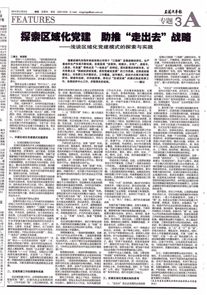 因此,在新形势下,如何转变基层党建工作方式、创新工作方法,已成为当前迫切需要解决的新课题;探索诸如采取区域化党建的形式,对于企业积极实施“走出去”战略,开展跨国、跨地、跨区域经营,起着举足轻重的作用。上汽集团对跨地、跨区域党建工作高度重视,先后制订《关于上汽集团加强跨地区控股企业党建工作的实施意见》《关于进一步加强跨地区投资企业党建工作的意见》等,要求“组织全覆盖、体系可复制、机制成常态、队伍增活力”。