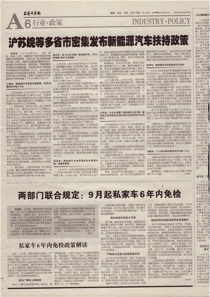 日前,公安部、国家质检总局联合下发《关于加强和改进机动车检验工作的意见》。《意见》规定,自2014年9月1日起,试行6年以内的在用私家车(非营运轿车和其他小微型客车)免予上线检验,每两年需要定期检验时,车主只需按照《中华人民共和国道路交通安全法》和《中华人民共和国车船税法》等规定提供交通事故责任强制保险、车船税证明,将交通事故和交通安全违法处理完毕后,可以直接领取检验标志。