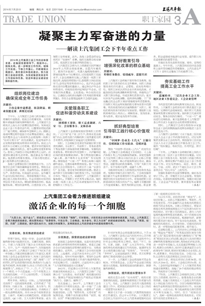 上汽集团工会将制订《关于推进三层次独立法人企业工会工作的指导意见》,切实发挥集团直管企业工会的作用,帮助指导三层次独立法人企业工会依法独立开展各项工会工作,做到“组织健全、维权到位、作用明显、职工信赖”。