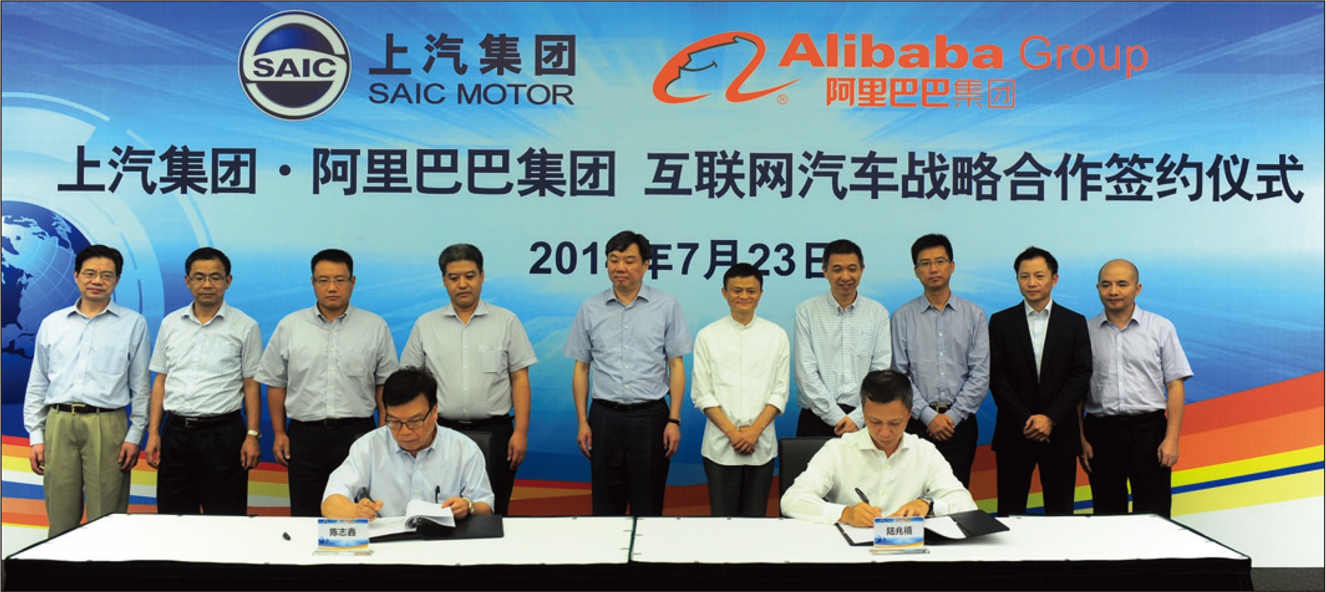 本报讯 7月23日,上汽集团与阿里巴巴集团在上海签署“互联网汽车”战略合作协议。双方表示,将积极开展在“互联网汽车”和相关应用服务领域的合作,共同打造面向未来的“互联网汽车”及其生态圈。上汽集团董事长、党委书记陈虹,上汽集团总裁陈志鑫,阿里巴巴集团董事长马云,阿里巴巴集团CEO陆兆禧出席签字仪式。上汽集团副总裁周郎辉主持仪式。上汽集团财务总监谷峰、上汽乘用车总经理王晓秋和阿里巴巴集团CTO王坚、阿里小微金服集团CRO胡晓明等双方领导也出席签字仪式。