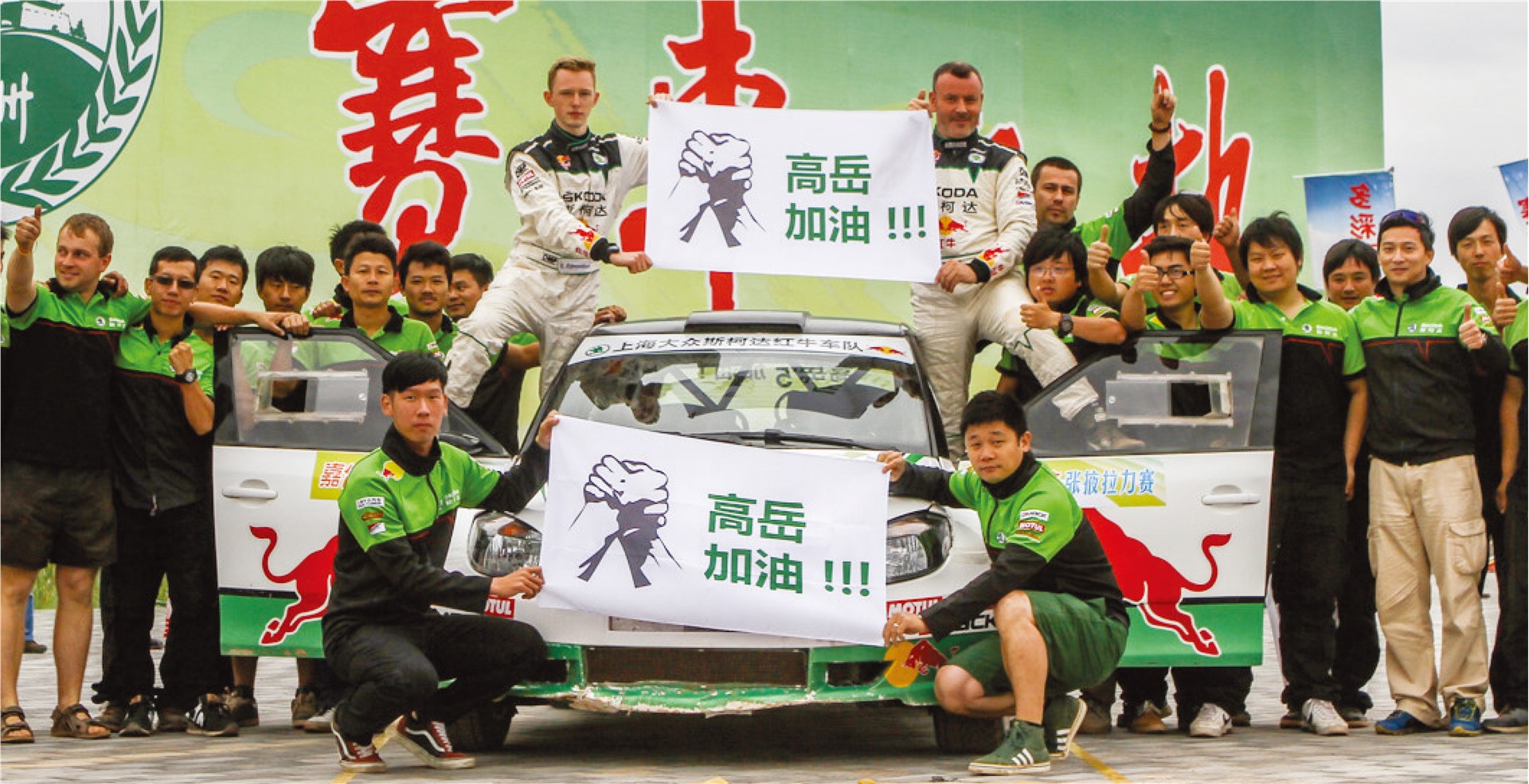 上海大众斯柯达红牛拉力车队凭借外援车手内尔·麦克西的精彩表现,顺利夺得全场亚军,并斩获国家四驱组队赛杯冠军。收车仪式上,斯柯达红牛车队为远在上海养病的车队经理高岳加油。